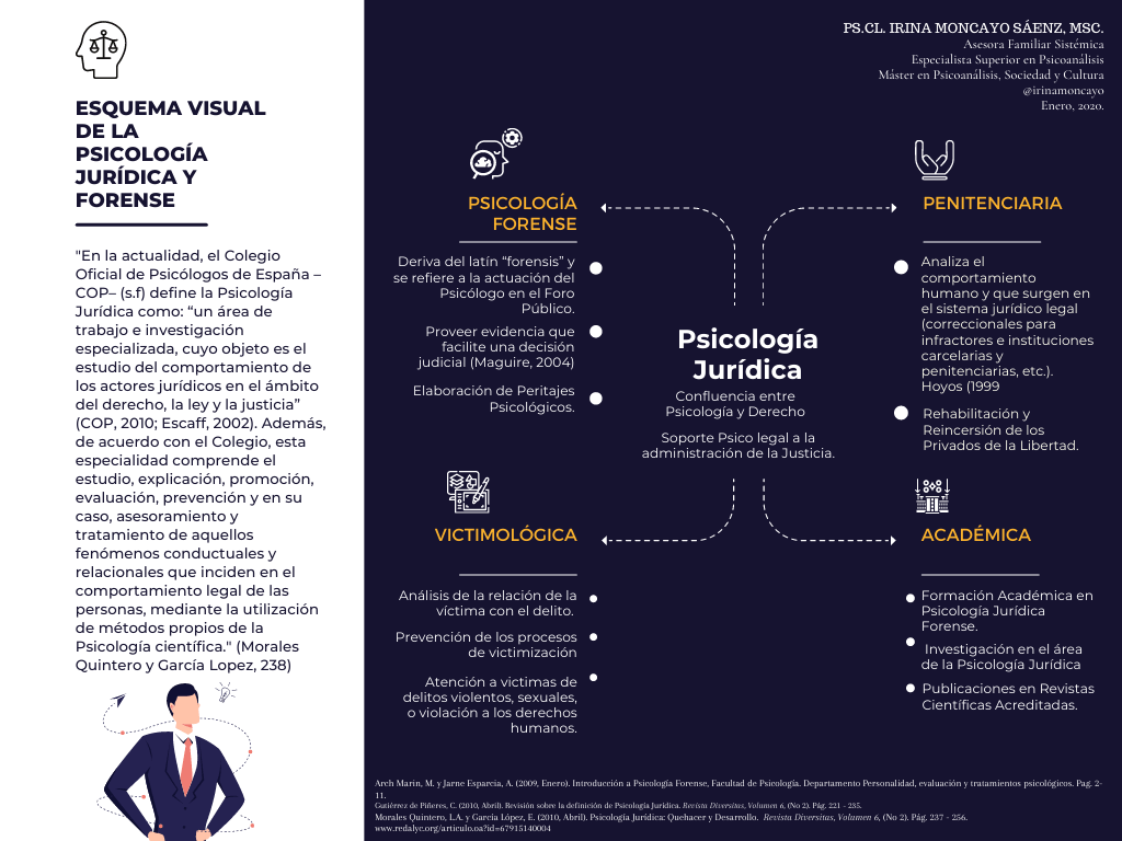 «En la actualidad, el Colegio Oficial de Psicólogos de España –COP– (s.f) define la Psicología Jurídica como: “un área de trabajo e investigación especializada, cuyo objeto es el estudio del comportamiento de los actores jurídicos en el ámbito del derecho, la ley y la justicia” (COP, 2010; Escaff, 2002). Además, de acuerdo con el Colegio, esta especialidad comprende el estudio, explicación, promoción, evaluación, prevención y en su caso, asesoramiento y tratamiento de aquellos fenómenos conductuales y relacionales que inciden en el comportamiento legal de las personas, mediante la utilización de métodos propios de la Psicología científica.»